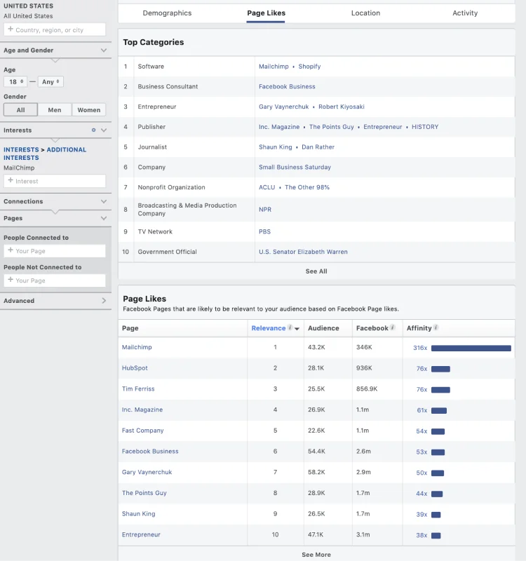 Here's a snapshot of the Top Categories of Facebook Pages people who like Mailchimp have also liked, as well as specific Facebook Pages they like that are likely to be relevant to the audience you’ve filtered by.